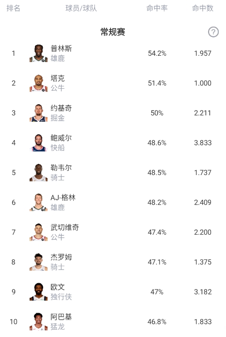 上榜規(guī)則:球員出場率到達70%且場均至少命中1記三分才能上榜