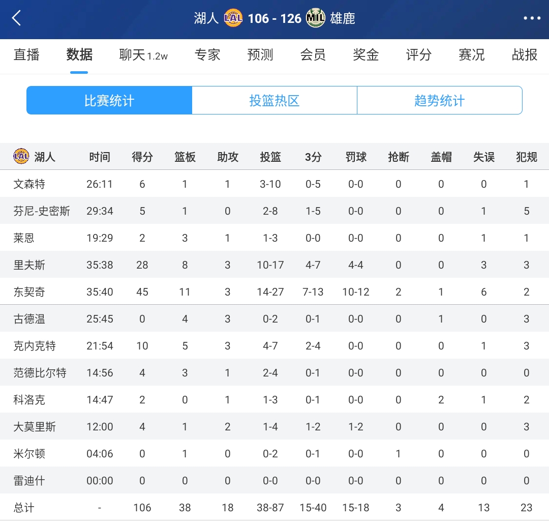 03月14日訊 NBA常規(guī)賽,湖人客場106-126不敵雄鹿。