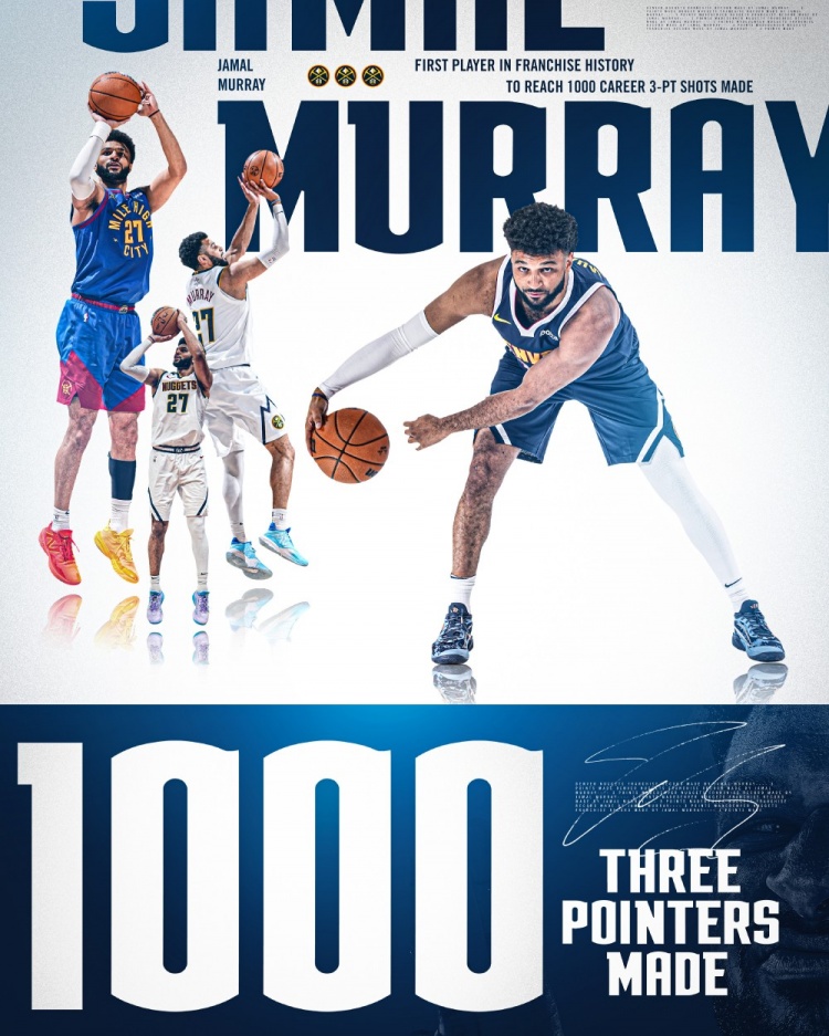 比賽第二節(jié),穆雷三分8投3中、合計(jì)10投5中得到15分,這樣一來穆雷掘金生涯三分命中數(shù)達(dá)到1000記,隊(duì)史首人!