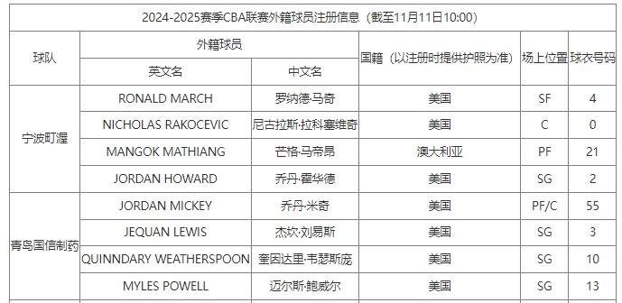11月11日訊 今天,CBA官方更新了外籍球員注冊信息表,青島新援喬丹-米奇完成注冊。