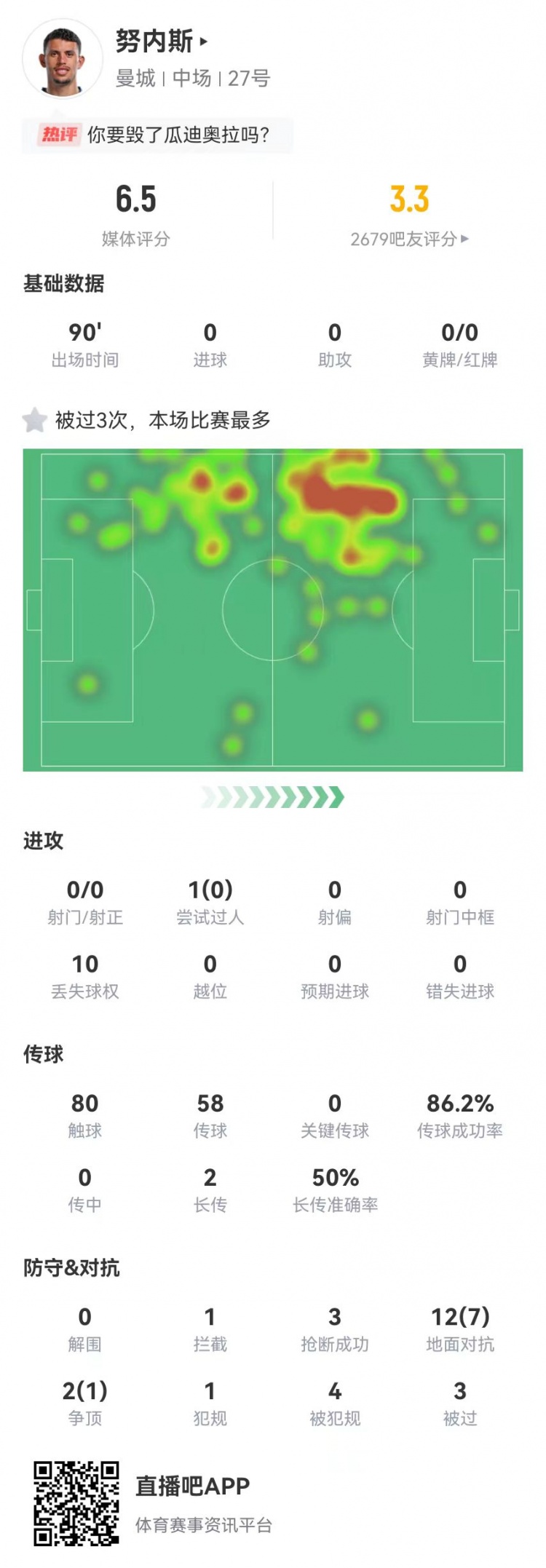 12月16日訊 曼城在本輪英超焦點戰(zhàn)1-2被曼聯逆轉絕殺,客串左后衛(wèi)的努內斯本場數據如下: