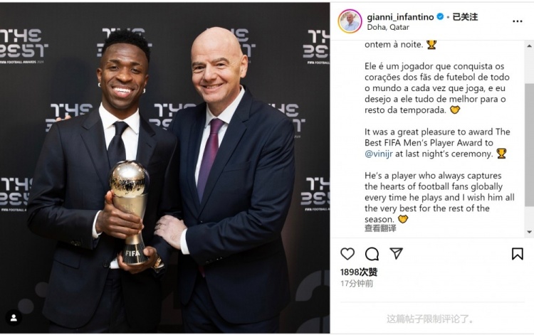 12月18日訊 維尼修斯當(dāng)選FIFA2024年度最佳球員,國(guó)際足聯(lián)主席因凡蒂諾社媒對(duì)他表示祝賀。